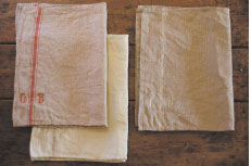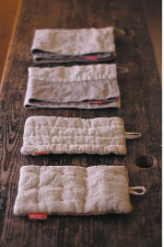 リネン(亜麻)が、北欧・ロシアなど寒い地方で栽培されるのに対し、ラミー(苧麻)は、アジアなど熱い地方で採れる麻です。ヨーロッパで古くから衣類やベッドリネンに使われているのは亜麻だけに限られていますが、日本では、一括して「麻」と呼んでしまいます。麻には他にもジュート(黄麻)などたくさんの種類があるのですが、上等な麻であるリネン以外は、みんなざらざらとしてごわつきのあるものばかりです。それでも、ラミーなどは水にたいへん強く、古くから船舶用の綱や漁網に使われました。写真の四角い鍋つかみは、そのラミーとリネンとを半分ずつ合わせて、日本で織られた生地を使って作りました。